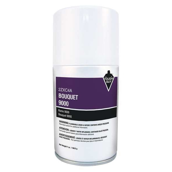 Air Freshener Refill, Liquid, Fragrance Bouquet, Aerosol Spray, 7 oz, Product Series Tough Guy 9000, Refill Life 90 day, NSF Rating Not Rated, Coverage 950 cu ft, Black; Purple; White, Compatible Grainger Part Number 2ZXA9, 2ZXC1, Compatible Mfg. Model Number 2ZXA9, 2ZXC1, Biodegradable No, VOC Content 26 Percent, Flash Point 132 Degrees F, Length 2 1/2 in, Width 2 1/2 in, Height 5 3/4 in, Net Weight 198.45 g