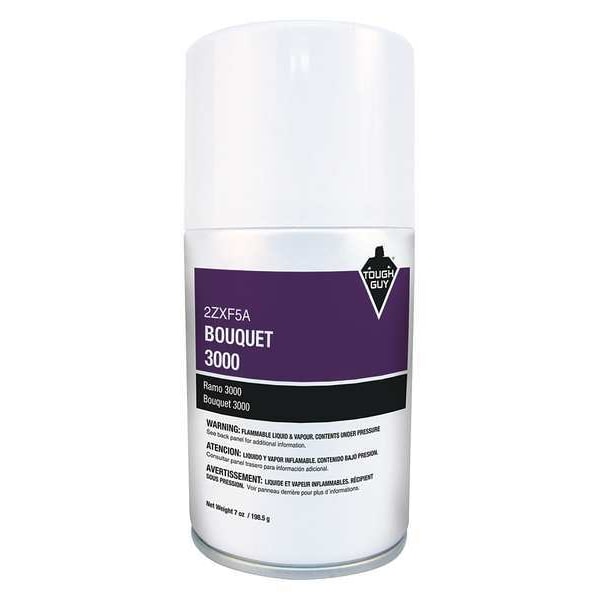 Air Freshener Refill, Liquid, Fragrance Bouquet, Aerosol Spray, 7 oz, Product Series Tough Guy 3000, Refill Life 30 day, NSF Rating Not Rated, Coverage 950 cu ft, Black; Purple; White, Compatible Grainger Part Number 2ZXA9, Compatible Mfg. Model Number 2ZXA9, Biodegradable No, VOC Content 26 Percent, Flash Point 132 Degrees F, Length 2 1/2 in, Width 2 1/2 in, Height 5 3/4 in, Net Weight 198.45 g