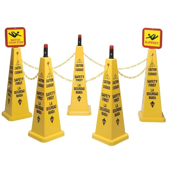 Cone Kit, Kit Components Description (2) 20 ft Yellow Plastic Chains, (2) Signs, (3) Red Flashing Lights, (4) Message Labels, (5) Yellow Cones, Kit Components - Grainger Model No. (2) 2LEB3, (2) 6VKT2, (3) 2LEC9, (5) 6VKR6, (5) Yellow Cones (Caution Safety First), Cone Size 26 in x 10 9/10 in, Sign Message (2) Message Boards with 4 Labels (Slippery, Watch Your Step), (2) 20 ft Yellow Plastic Chains, Sign Subject Matter Safety Incentive and Motivational, Sign Format Other Format
