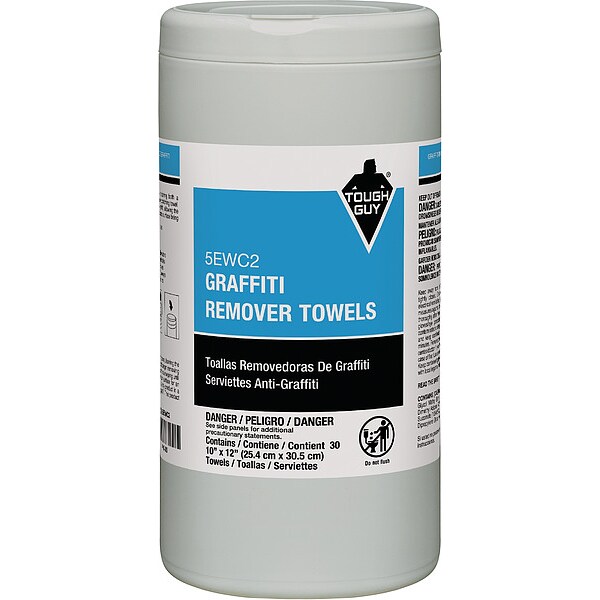 Grafitti Remover Wipes, Wet Cleaning Wipes, Primary Chemical None, Wet Contact Time No Efficacy, 30 ct, Container Type Canister, Sheet Size 12 1/4 in x 10 1/2 in, Fragrance Unscented, Ready to Use/Concentrated Ready to Use, Cleaner Form Wipe, Application Graffiti Removal, Biodegradable No, Color Gray/White, Disposable/ Reusable Disposable, Features Removes Paint, Permanent Marker, Ink, Crayon and Adhesive from Multiple Hard Surfaces, Formula Pre-Moistened, Material Cloth, NSF Rating Not Rated
