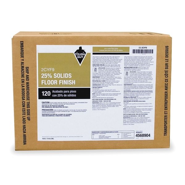 High Solids Floor Finish, Size 5 gal., Solids Content 0.25, Coverage per Gallon 2000 sq ft, Required Brush Speed 1500 to 2000 rpm, Maintenance Frequency Multiple, Dry Time 20 to 30 min.