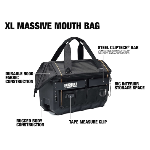 The ToughBuilt XL Massive Mouth Bag is maximizing how pros carry tools and supplies on the go. The patent-pending opening is the widest most expansive chamber in the market for superior accessibility and it with all of ToughBuilt’s patented ClipTech pouches for the most comprehensive tool organization.