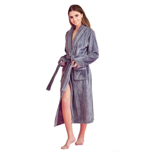 Women Plush Shawl Collar Robe, Fleece Bathrobe, Gray S/M
