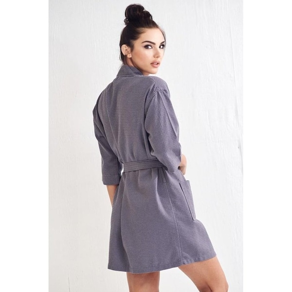 Women's Short Waffle Kimono Bathrobe-Thigh Length Waffle Weave Kimono Robe. Material: 60% cotton / 40% polyester waffle weave. Featuring 3/4 sleeves, two patch pockets, and a flat neckline, this short waffle bathrobe is perfect for home, spa, or even as a bridesmaid gift.