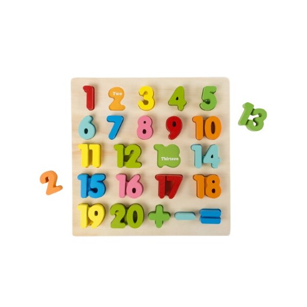 The Wooden Number Puzzle by Toy Time is a fun classic toy to get your children engaged in learning! The puzzle set, made from smooth wood, contains the numbers 1 through 20 along with basic math signs, and even features words under each piece. The puzzle is not only a fun activity for your little one, but is a great STEM toy for learning numbers, counting, color recognition, and the basics of math! The removable pieces are bright and colorful and also help with hand-eye coordination and dexterity as kids play with the numbers and try to fit them back into the puzzle. The puzzle is a timeless toy that your little boy or girl will surely love for years to come!