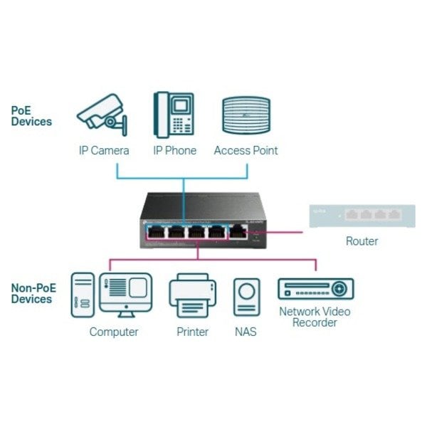 5-Port Gigabit Easy Smart Switch with 4-Port PoE+, Power Adapter, Installation Guide, Rubber Feet