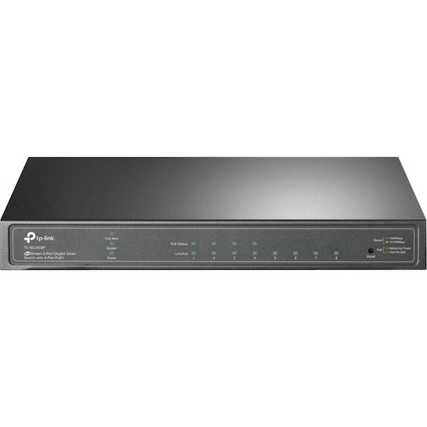 This TP-LINK 8 Port Gig Poe Plus Smartswtch has an input voltage of 53.5 V DC, a depth of 4.9", a height of 1", a width of 8.2", a power source of AC Adapter, and a power consumption of 69.70 W. It is a type of Ethernet Switch.