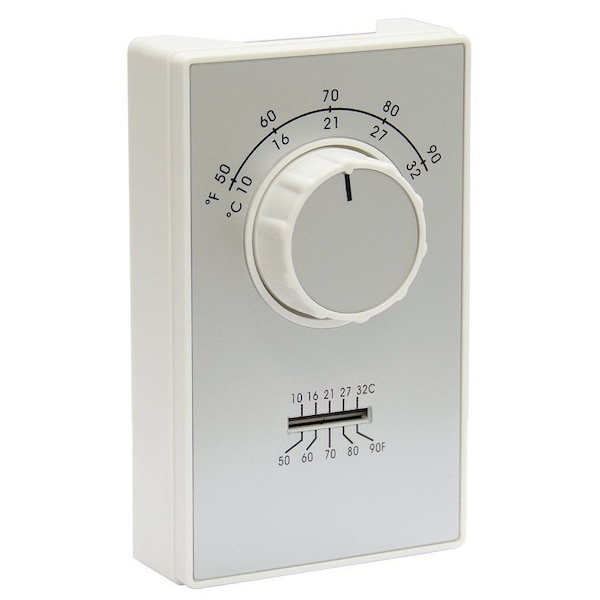 Line Voltage Thermostat, Heat Only, SPST, Terminals, 50-90 Degrees F, White