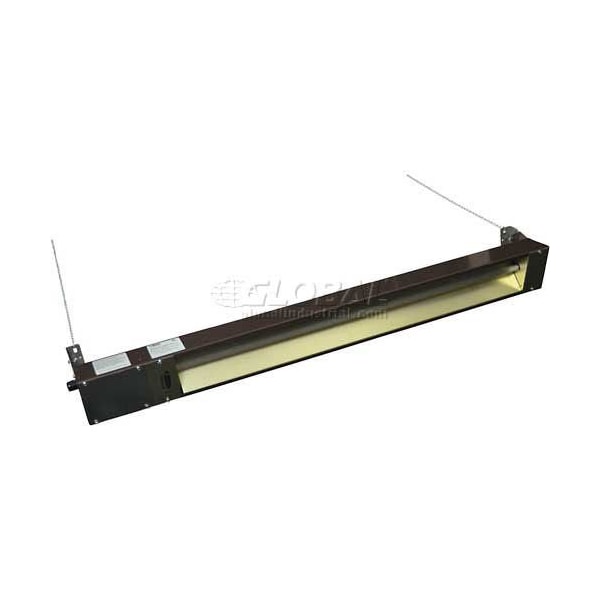 Electric Infrared Heater, Indoor/Outdoor: Indoor/Outdoor, Mounting Type: Ceiling, Watts: 1500, BtuH Output: 5120, Voltage: 120, Amps @ 1 Phase: 12.50, Beam Pattern: 60 Degrees, Number of Lamps: 1, Height: 6-1/2, Width: 5-3/8, Length: 41, Housing Material: Steel, Phase: 1, Finish: Brown Powder Coated, NEMA Plug: HSW NEMA, Cord Length: 6 ft., Cord Type: 3 Wire Grounded, Standards: ETL, Includes: 2 4' Long Chains, 4 S Hooks, Heat Pattern Coverage @ Floor 10 Ft.: 14 x 12, Heat Pattern Coverage @ Floor 12 Ft.: 16 x 14, Heat Pattern Coverage @ Floor 8 Ft.: 12 x 10, Watts Delivered/Sq.-Ft. 10: 12, Watts Delivered/Sq.-Ft. 12: 9, Watts Delivered/Sq.-Ft. 8: 17
