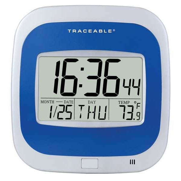 Digital Thermometer, 23 Degrees to 122 Degrees F/-5 Degrees to 50 Degrees C, Application Indoor, 10 in H x 9 1/4 in W 4-Digit Backlit LCD Display - 2 1/8 in Digit Height, Functions Date/Day, Temperature, Time, 10 in H x 9 1/4 in W x 1 in D, (2) AAA Batteries, Temperature Resolution 0.5 Degrees F, 0.5 Degrees C