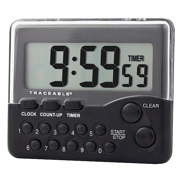 Digital Timer, Overall Depth 1 in, Overall Diameter Not Applicable, Overall Height 2 1/2 in, Overall Width 3 in, Digital Display Screen Type LCD, Alarm Type Audible, Display Type Digital, Maximum Time Setting 9 hrs, 59 minutes, 59 seconds, Minimum Time Setting 1 sec, Count Direction Count Down, Count Up, Number of Channels 1, Clock Function Included Yes, Calibration Certificate Type Traceable, Includes Magnetic Back, Batteries Included Yes, Battery Chemistry Alkaline, Battery Size AAA