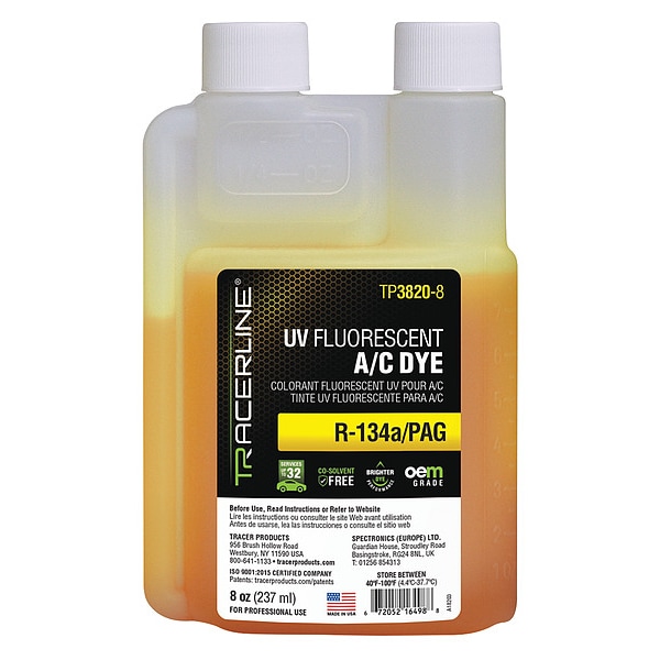 Leak Detection Dye, Compatible Fluid Type R-134a Refrigerant, Series UV Flourescent, Container Type Bottle, Container Size 8 oz, Color Green, Standards SAE J2297, Product Type Leak Detection Dye, Flash Point 40 Degrees F, Fluorescent Fluorescent