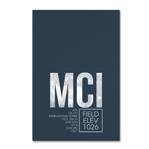 This ready to hang, gallery-wrapped art piece features a minimalist poster of the Kansas City airport code and air traffic control coordinates.