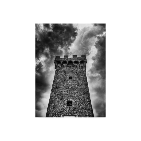 This ready to hang, gallery-wrapped art piece features a black and white photograph of a stone tower against a cloudy sky.