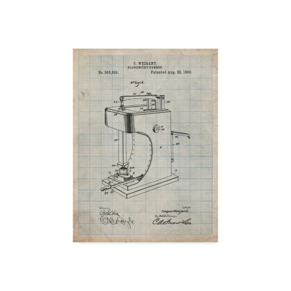 This ready to hang, gallery-wrapped art piece features a patent poster of blacksmith hammer.