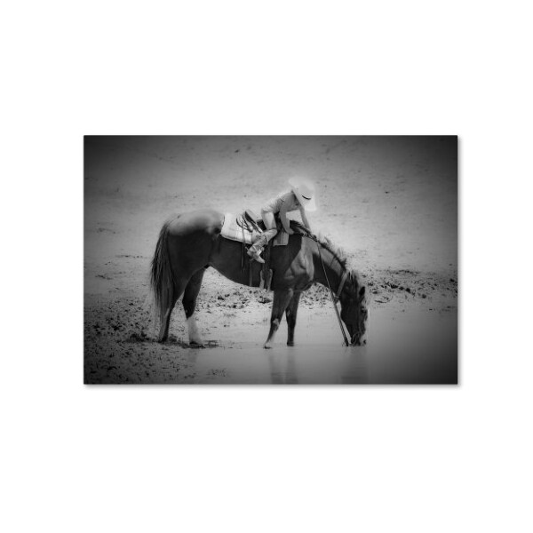 This ready to hang, gallery-wrapped art piece features a young cowboy and his horse at a watering hole.