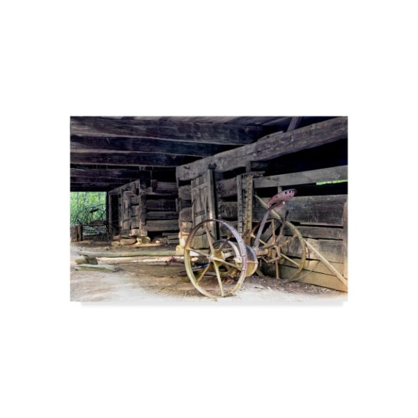This ready to hang, gallery-wrapped art piece features a metal farming tool under a wooden shed.