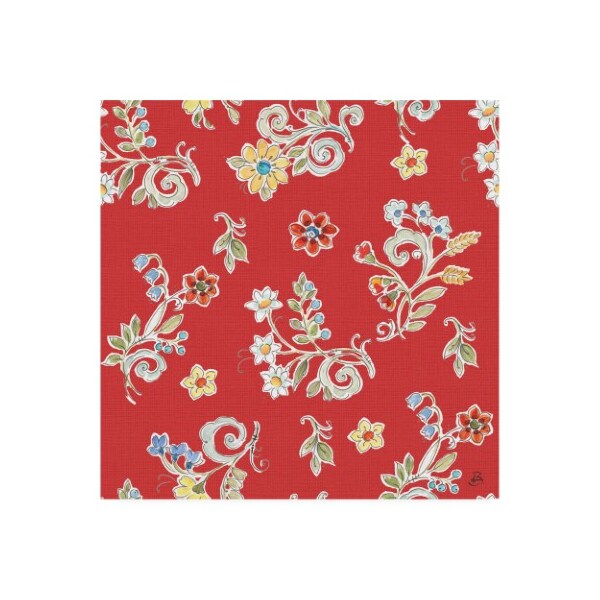 This ready to hang, gallery-wrapped art piece features a country floral pattern against a red background.