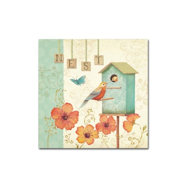 This ready to hang, gallery-wrapped art piece features a bird, a butterfly, a teal birdhouse, orange flowers, and the word "nest" against a tan and teal background.