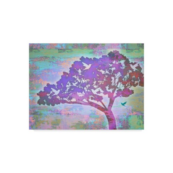 This ready to hang, gallery-wrapped art piece features a purple tree over a distressed background.