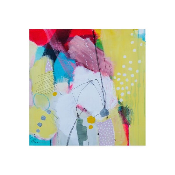 This ready to hang, gallery-wrapped art piece features bold colors painted onto an abstract composition.