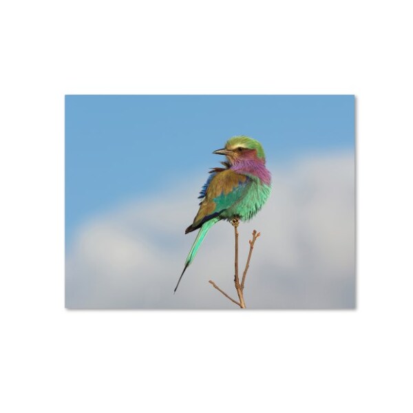 This ready to hang, gallery-wrapped art piece features a small colorful bird sitting in the center of a cloudy scene.