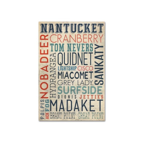 This ready to hang, gallery-wrapped art piece features a collage of different phrases that have to do with Nantucket.