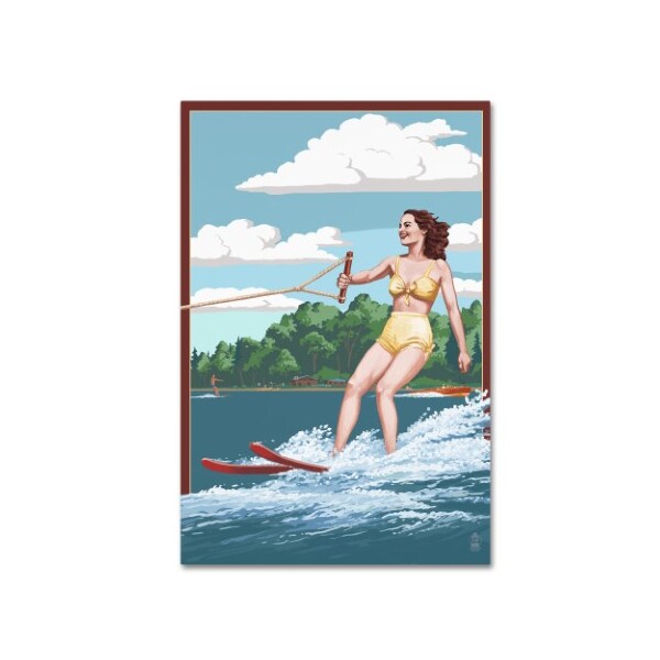 This ready to hang, gallery-wrapped art piece features a woman being pulled by a boat on skis in a lake.