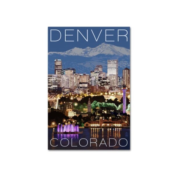 This ready to hang, gallery-wrapped art piece features a cityscape of Denver at night showing different buildings lit up.