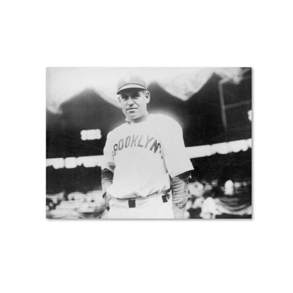 This ready to hang, gallery-wrapped art piece features a portrait of a baseball player standing a field.