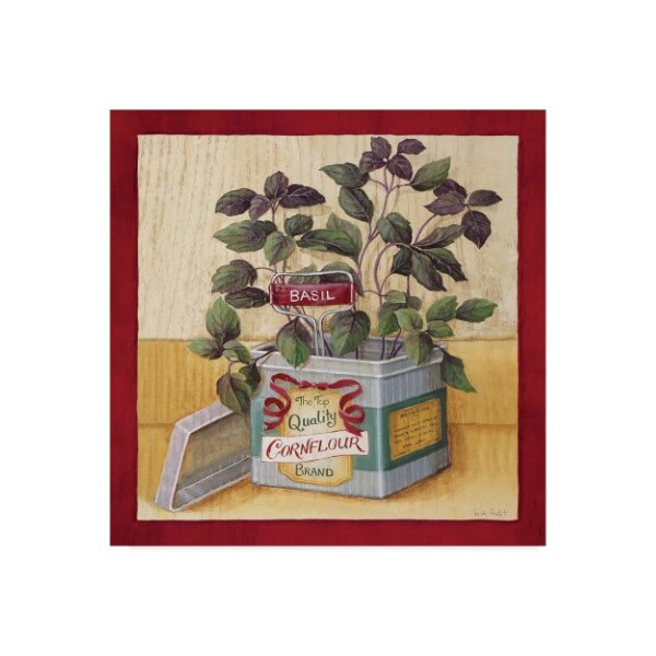 This ready to hang, gallery-wrapped art piece features basil growing in an old cornflour tin.