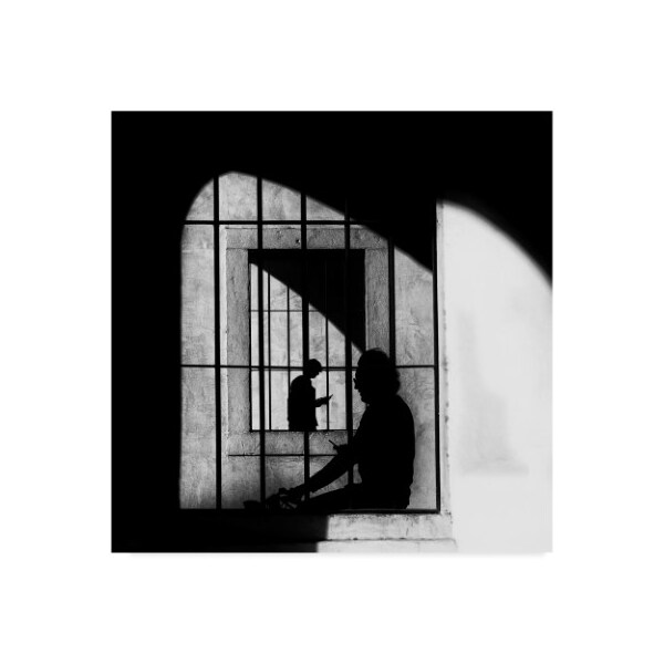 This ready to hang, gallery-wrapped art piece features a man sitting behind bars cast on the wall.