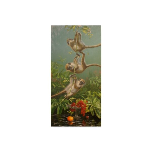 This ready to hang, gallery-wrapped art piece features three monkeys hanging in the center of the frame.
