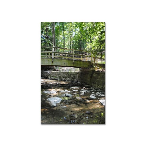 This ready to hang, gallery-wrapped art piece features a bridge over water surrounded by trees.