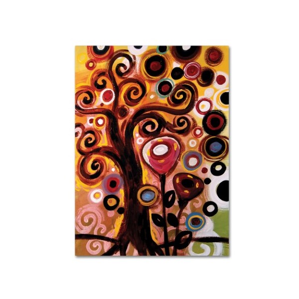 This ready to hang, gallery-wrapped art piece features a tree with swirling branches surrounded by blue, pink, and maroon flowers.