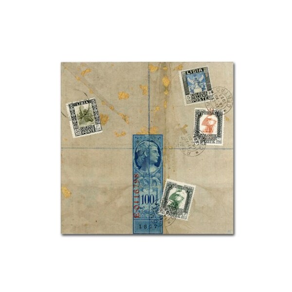 This ready to hang, gallery-wrapped art piece features a piece of mail art with several stamps over torn paper.