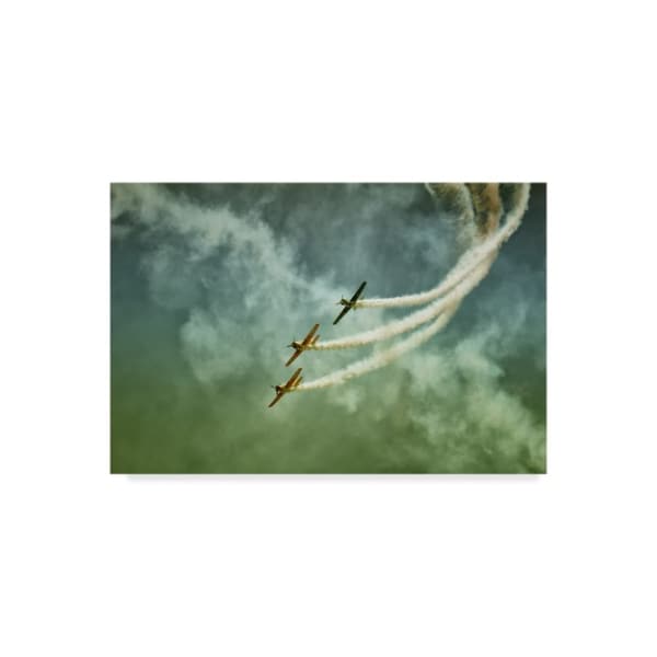 This ready to hang, gallery-wrapped art piece features three planes flying through a cloudy sky.