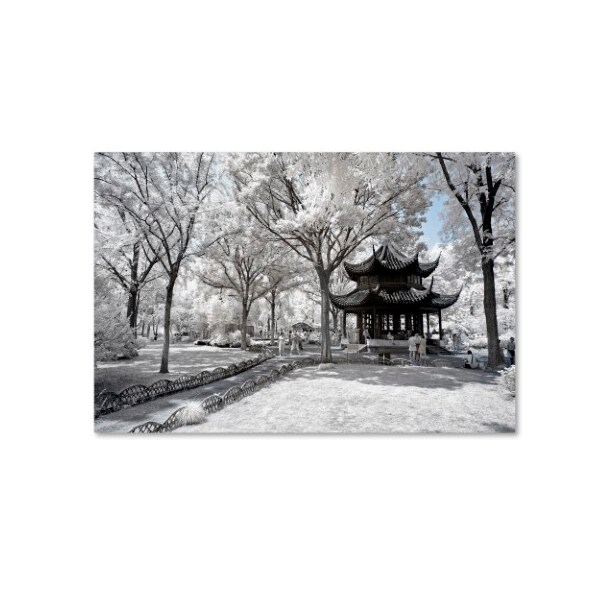 This ready to hang, gallery-wrapped art piece features white grass and trees surrounding a small gazebo, tourists standing and sitting in the courtyard around it.