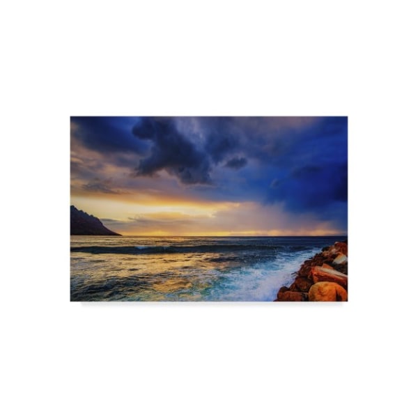 This ready to hang, gallery-wrapped art piece features a coastal landscape under a cloudy sky.