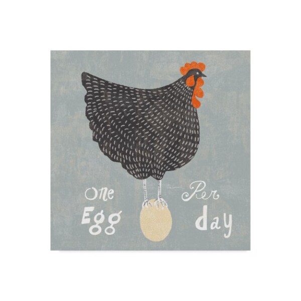 This ready to hang, gallery-wrapped art piece features the words "One Egg Per Day" around an illustration of a hen standing on an egg.