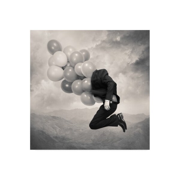 This ready to hang, gallery-wrapped art piece features a man in a suit floating away by a bundle of balloons.