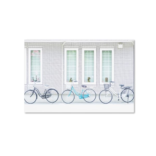 This ready to hang, gallery-wrapped art piece features a row of bikes sitting in front of a building.