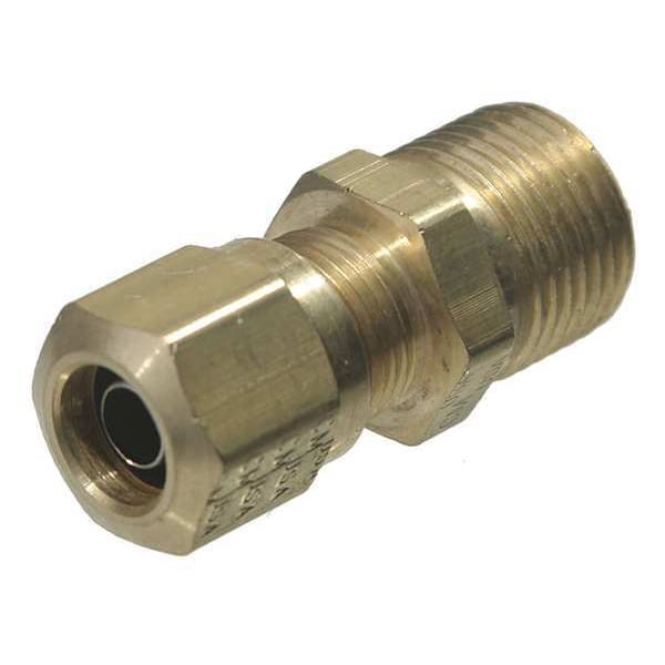 Compression Fitting Adapter, Application Air, Fitting Side A Connection Type Compression, Fitting Side B Connection Type MNPT, Fitting Material Brass, Fitting Side A Tube Outer Diameter 3/8 in, Maximum Operating Pressure 150 psi, Maximum Operating Temperature 200 Degrees F, Overall Length 1 3/16 in, Specific Fitting Shape Straight Adapter, Fitting Side B Pipe Size 1/4 in, Compatible Fitting Brands Not Applicable, Thread Size B 1/4-18, System of Measurement Imperial, Standards SAE J246