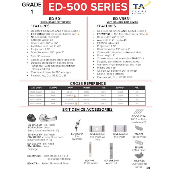 The Trans-Atlantic VR531 series fire rated "Vertical Rod" exit device is suitable for commercial and industrial applications where heavy duty usage is anticipated such as office buildings, retail spaces and hotels. Moreover, it fits with doors up to 36 in. wide and 84 in. in height where a 12 in. extension is available for purchase for taller doors. It blends the utility of a vertical rod application with the appearance of a modern style panic device. It comes with a top and a bottom latch. However, the exterior lever is sold separately. These series meet the performance standards of Grade 1 and ADA compliant exit devices. Item is available in Aluminum, Duronodic and Stainless Steel finishes.