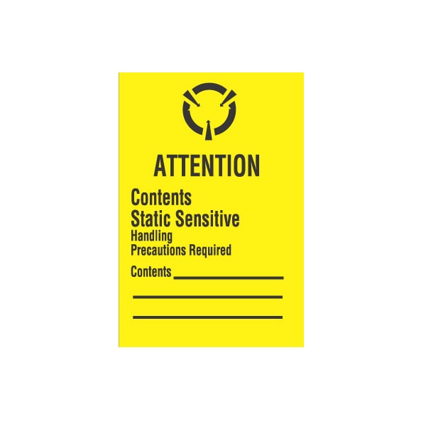 1x1-1/2, "Attention Contents Static Sensitive Handling Precautions Required". The LB9170 and LB 9180 yellow paper attention label that comes on a 500 count roll. The permanent acrylic adhesive label provides a warning message for handling electrostatic sensitive devices.