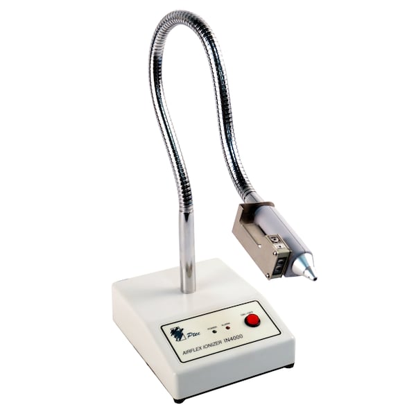 The IN4000 flexible ionizing nozzle frees the operator's hands during assembly and manufacturing processes. A proximity sensing photoelectric eye controls the power and air flow for easy hands free ionization, which reduces compressed air costs and extends the life of the ionizer. The model IN4000 ionizing air nozzle produces a 68KHz AC output of approximately 2200V and a continuous stream of balanced air ions.