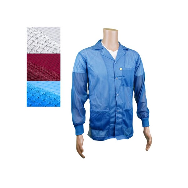 The 8812 Lapel Collar jackets are fabricated from light weight 88% polyester and 12% carbon fabric for unmatched operator comfort. Excellent for warm environments. Superior workmanship provides reliable panel to panel continuity. The JKC Series 8812 jackets maintains consistent continuity readings for up to 100 wash cycles. Available in light blue, maroon and white.