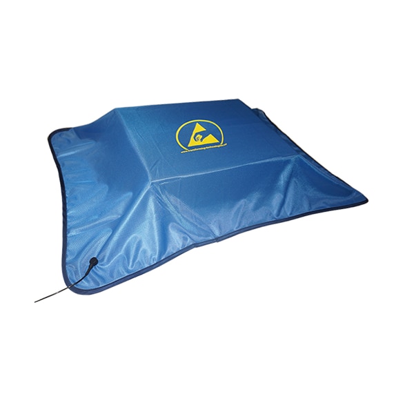 This cover creates a Faraday cage effect around the covered product to shield from electrostatic fields and electrostatic discharges (ESD). This washable cover has a surface resistivity of 10^5 ohms/sq. The Workstation Cover has a silk-screened ESD symbol, bound edges and includes a 4mm grounding snap.