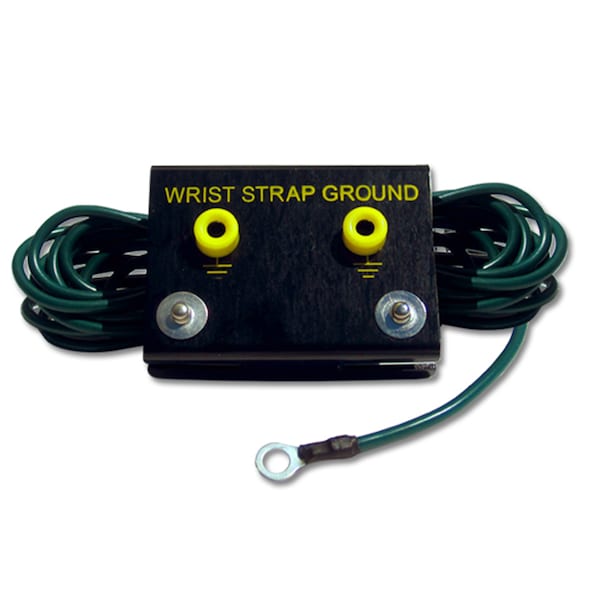 The CP4070 Metal Bench Mount Common Point Ground offers the common ground point required by ANSI/ESD S-6.1 and ANSI/ESD-S20.20. The metal enclosed box mounts under front edge of workstation. Includes a 15′ long ground cable with #10 ring terminal connector. Two banana jack receptacles for secure ground connections. Two parking studs (4mm) for storing cords when not in use.