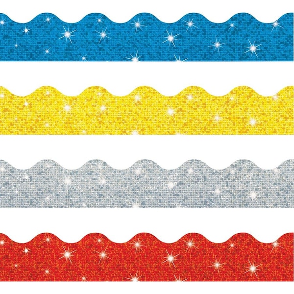 Spruce up your classroom and kick up the fun with this variety trimmer pack ready to brighten your walls, create eye-popping displays, enhance themed events and more. Layer patterns on these Sparkle Terrific Trimmers with solid or metallic trimmers (sold separately) for extra impact. Set includes Sparkle Trimmers in blue, silver, yellow and red.